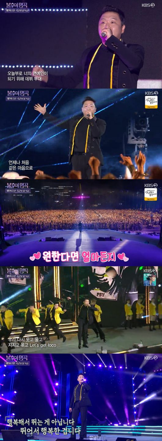곧이어 '댓 댓'(That That) 무대로 뜨거운 열기를 이어간 싸이는 "아낌없이 남김없이 내일 일어나도 후회 없이 미친 듯이 뛰어보자. 행복해서 뛰는 게 아니라 뛰어서 행복한 것"이라는 멘트를 남겼다.