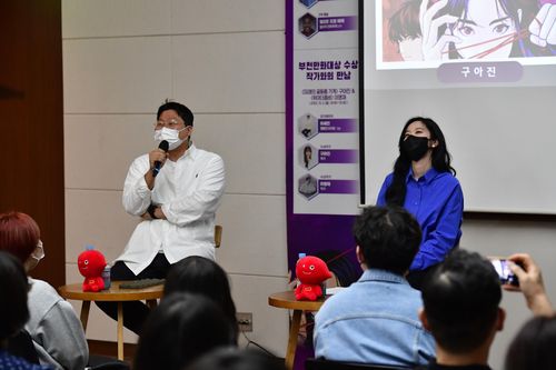 부천만화대상 수상자 대담에서 발언 중인 이명재 작가(좌)와 구아진 작가(우) |