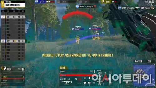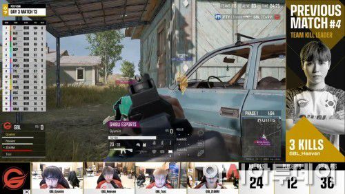 13매치 자기장은 에란겔 갓카로 형성됐다. 경기 초반 루인스 남쪽 집단지에서 기블리 이스포츠와 인펜트리가 전투를 벌였다. 기블리가 빠른 파밍 이후 인펜트리를 기습하는 구도였지만 수비가 워낙 단단했고 결국 패배했다.