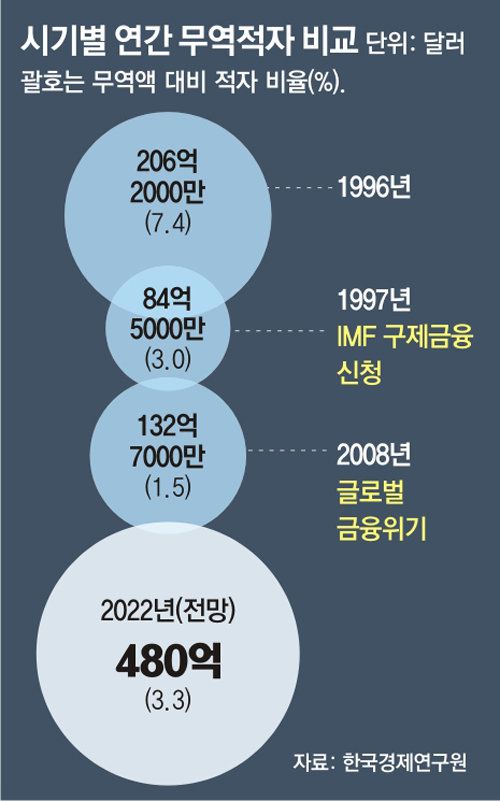한국경제연구원은 올해 무역적자가 480억 달러에 이를 것으로 분석했다. 이 액수는 국내 무역통계가 작성된 1964년 이후 최대다. 지금까지 무역적자 규모가 가장 컸던 해는 외환위기 직전인 1996년으로 206억2000만 달러였다. 당시 전체 무역액 대비 무역적자 비율은 7.4%나 됐다. 올해 이 비율은 3.3%로 1997년(3.0%)을 넘어 26년 만의 최고치가 될 것으로 한경연은 내다봤다.