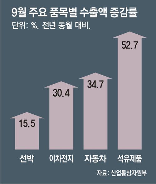 수출이 주춤하지만 무역적자 최대 원인인 에너지 수입액은 여전히 고공 행진하고 있다. 9월 석유·석탄·가스 등 3대 에너지 수입액은 179억6000만 달러로 전년(99억1000만 달러) 대비 81.2% 늘었다. 이창양 산업부 장관은 “현재 수준의 에너지 가격이 지속되면 무역수지 개선은 쉽지 않을 것”이라고 했다. 겨울이 되면 난방을 위해 에너지 수요가 더 늘어나고, 이는 무역적자를 부채질할 것으로 보인다. 김 교수는 “에너지 수입이 늘어날 겨울뿐 아니라 내년 상반기까지 무역적자가 지속될 가능성이 있다”고 말했다.