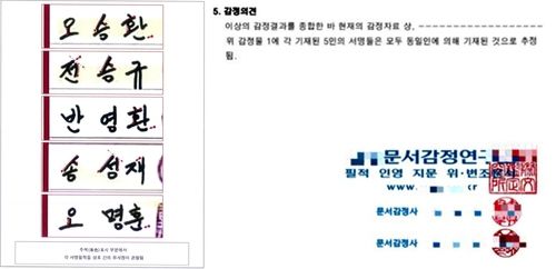 또 '5인의 서명 필적은 모두 굵은 촉 사인펜으로 추정되는 동일한 필기구로 기재됐다', '전체적인 배자 형태, 자획의 구성미 및 운필(펜의 움직임)의 숙련 정도 등의 안목 검사에서 상호 유사한 형태 수준의 필적으로 분석된다' 등 의견을 덧붙였다.