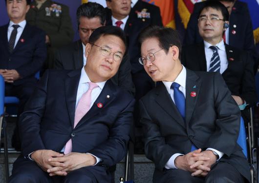 정진석 국민의힘 비상대책위원장과 이재명 더불어민주당 대표가 지난 1일 오전 충남 계룡대 대연병장에서 열린 건군 ‘제74주년 국군의 날’ 기념식에서 대화하고 있다. (사진=연합뉴스) |