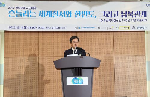 김 지사는 이날 고양 킨텍스에서 열린 '10·4 남북정상선언 15주년 기념 학술회의' 축사를 통해 "지금의 정부가, 또 이 정권에서 남북관계가 훨씬 더 경색될 가능성이 크기 때문에 경기도에 할 일이 많다"며 이같이 말했다.