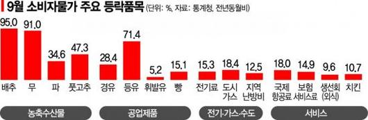 세부 품목을 살펴보면 지난달 배춧값은 1년 전보다 무려 95% 올랐다. 가격이 두 배 가까이 뛰었다는 의미다. 무도 마찬가지로 91% 상승세를 나타냈다. 이 밖에 풋고추(47.3%), 파(34.6%) 등 김장에 필요한 주요 품목이 일제히 높은 물가상승률을 나타냈다. 지난달 폭우 등 기상 여건이 좋지 않아 일조시간이 줄어들면서 병해로 인한 생육 부진이 주원인으로 파악된다. 여기에 추석 명절을 앞두고 수요가 늘어난 영향도 더해졌다. 채소류 전체 물가 상승률은 22.1%로 나타났다.