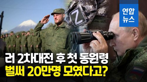 (서울=연합뉴스) 러시아가 지난달 21일 예비군 대상의 부분 동원령을 내린 뒤 약 2주 만인 현재까지 20만 명이 넘는 병력을 징집했다고 4일(현지시간) 밝혔습니다.