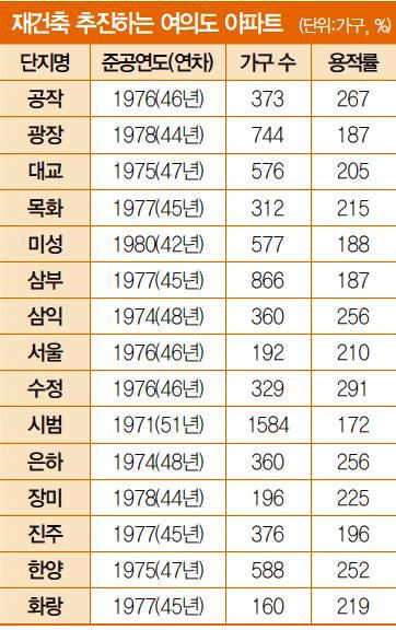 여의도 재건축 단지는 몇 가지 특징이 있다. 우선 대부분 단지가 아주 오래됐다는 점이다. 대부분 단지가 이미 재건축 연한 기준인 30년을 넘어섰으며 40년을 넘어선 곳도 많다.
