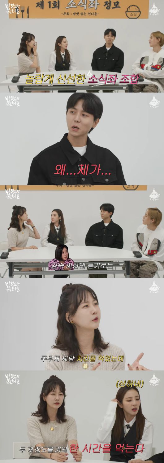 주우재는 자신이 왜 이 자리에 왔는지 모르겠다는 반응을 보였는데, 박소현은 "김숙 씨한테 듣기로는 치킨을 시켜서 먹는데 두 개 정도를 한 시간 동안 먹는다(고 하더라)"고 말했다.