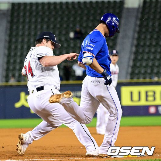 [OSEN=잠실, 최규한 기자] 6일 서울 잠실야구장에서 ‘2022 신한은행 SOL KBO리그’ 두산 베어스와 삼성 라이온즈의 경기가 열렸다. 3회초 1사 1, 2루 상황 삼성 강한울이 내야 안타를 치고 1루에서 세이프되고 있다. 2022.10.06 / dreamer@osen.co.kr