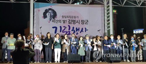 (창원=연합뉴스) 일제 강점기 항일 무장투쟁에 앞장선 김명시 장군을 기리는 행사가 7일 오후 경남 창원시 마산합포구 오동동 문화광장에서 열리고 있다. 2022.10.7 [열린사회희망연대 제공. 재판매 및 DB 금지] image@yna.co.kr ▶제보는 카카오톡 okjebo▶연합뉴스 앱 지금 바로 다운받기~▶네이버 연합뉴스 채널 구독하기 <저작권자(c)연합뉴스. 무단전재-재배포금지.>