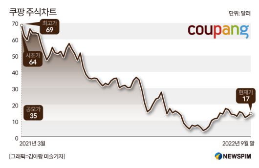 미국은 한국과 달리 개인투자자들에게 공모주를 의무 배정하지 않는다. 따라서 미국에 거주하는 한인들과 한국 투자자들은 쿠팡 상장 당시 시초가에 쿠팡 주식을 많이 매수한 것으로 알려져 있다. 쿠팡의 공모가는 35달러였지만 상장 당일 시초가는 81% 급등한 63.5달러에 형성됐다. 그런데 지금은 17달러이니 시초가 대비 손실율은 무려 -73%로 무시무시하다.