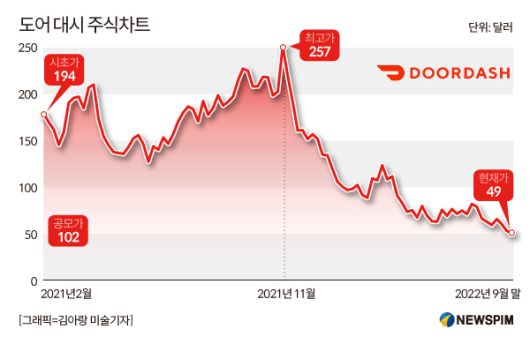 미국 1위 음식배달서비스 기업인 도어대시는 미국 내에서 우버이츠보다 점유율이 훨씬 높다. 2021년 2월 공모가 102달러에 신규 상장됐고, 시초가는 공모가 대비 90% 폭등한 194달러로 출발했다. 한때 공모가보다 152% 상승한 257달러를 기록했지만 2022년 9월 말 기준 공모가 대비 수익률은 -52%로 저조하다.