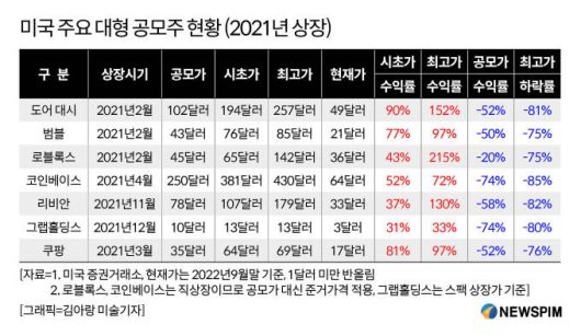 [서울=뉴스핌] 한태봉 전문기자 = 2021년 국내 증시에 상장된 주요 공모주 현황을 살펴본 결과 공모가보다 주가가 심각하게 폭락한 주식들이 많았다. 2022년에 상장된 공모주 역시 마찬가지다. 그렇다면 미국 공모주 시장 현황은 어떨까. 2021년 미국의 기업공개(IPO) 건수는 1000개를 돌파했다. 이는 2020년의 400여 개보다 2배 이상 늘어난 역대 최대 수준이다.