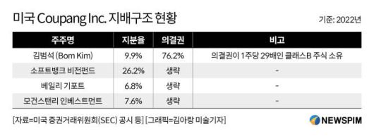 미국은 한국과 달리 차등의결권이 인정된다. 그래서 쿠팡 주식은 클래스A 보통주식과 클래스B 보통주식으로 구분해서 발행됐다. 김범석(Bom Kim) 창업자가 가지고 있는 클래스B 주식은 1주당 29배의 의결권을 가진다. 클래스A 주식의 의결권이 1주당 1배인 것과 비교하면 엄청난 차이다. 비록 김범석 창업자의 지분율은 9.9%에 불과하지만 76.2%의 의결권을 보유하고 있어 경영권 행사에는 전혀 어려움이 없다.