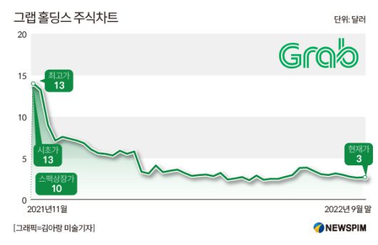 동남아시아 승차공유 및 음식배달사업 1위를 기록 중인 그랩홀딩스는 기업인수목적회사(SPAC)인 알티미터그로스(AGC)와의 합병을 통해 상장됐다. AGC의 나스닥 상장가격인 10달러를 공모가로 가정하면 신규상장 시초가는 공모가보다 31% 상승한 13달러로 형성됐다. 하지만 시초가가 거의 최고가였다. 그랩은 상장 당일 종가가 8.8달러를 기록하며 부진한 모습을 보이면서 지속적으로 하락했다. 2022년 9월 말 기준 공모가 대비 수익률은 -74%로 투자자들을 절망에 빠뜨렸다.