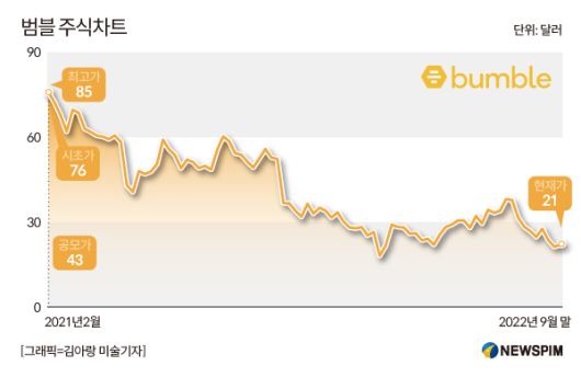 범블은 틴더에 이은 미국 2위의 데이팅앱이다. 여성 중심의 데이팅앱으로 차별화해 큰 인기를 끌고 있다. 범블도 2021년 2월 공모가 43달러에 신규 상장해 시초가가 공모가 대비 77% 상승한 76달러에 시작됐다. 한때 최고가 85달러를 기록하며 순항했지만 2022년 9월 말 기준 공모가 대비 수익률은 -50%로 부진하다.