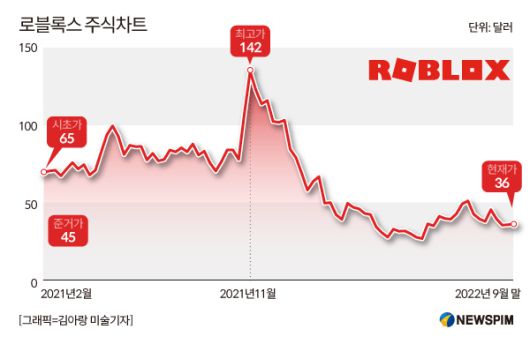 로블록스는 전통적인 기업공개와 달리 주식 신규발행 없이 미국 거래소에 직상장했다. 이런 경우 공모가격 대신 준거가격이 적용된다. 준거가격은 기존의 장외시장 거래가격과 투자은행들의 투자 규모 등을 반영해 거래소가 제공한다. 로블록스의 준거가격은 45달러로 결정됐는데 시초가는 65달러로 43% 상승하며 시작했다. 메타버스 열풍으로 한때 공모가보다 215% 폭등한 142달러까지 상승했지만 2022년 9월 말 기준 공모가 대비 수익률은 -20%에 그쳤다. 그나마 가장 하락폭이 작은 편이다.