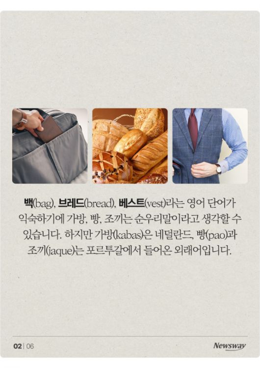 백(bag), 브레드(bread), 베스트(vest)라는 영어 단어가 익숙하기에 가방, 빵, 조끼는 순우리말이라고 생각할 수 있습니다. 하지만 가방(kabas)은 네덜란드, 빵(pao)과 조끼(jaque)는 포르투갈에서 들어온 외래어입니다.