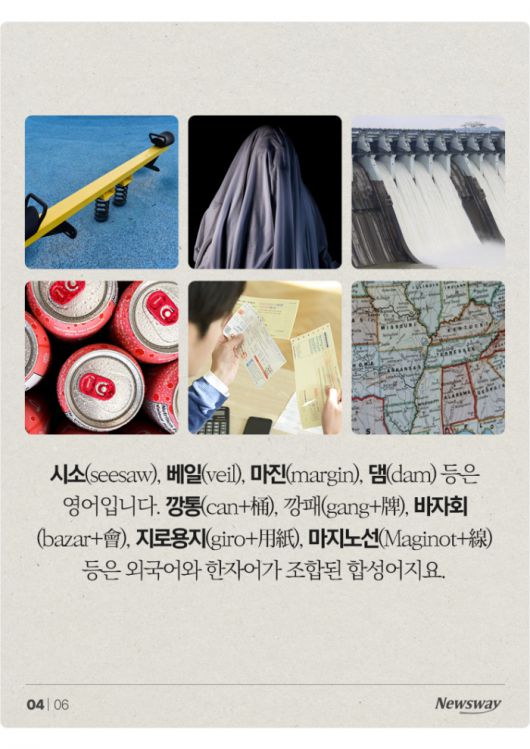 시소(seesaw), 베일(veil), 마진(margin), 댐(dam) 등은 영어입니다. 깡통(can+桶), 깡패(gang+牌), 바자회(bazar+會), 지로용지(giro+用紙), 마지노선(Maginot+線) 등은 외국어와 한자어가 조합된 합성어지요.