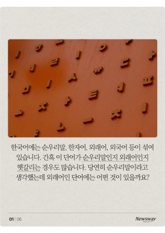 한국어에는 순우리말, 한자어, 외래어, 외국어 등이 섞여 있습니다. 간혹 이 단어가 순우리말인지 외래어인지 헷갈리는 경우도 많습니다. 당연히 순우리말이라고 생각했는데 외래어인 단어에는 어떤 것이 있을까요?