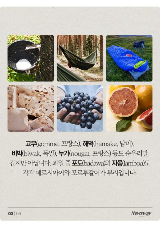 고무(gomme, 프랑스), 해먹(hamake, 남미), 비박(biwak, 독일), 누가(nougat, 프랑스) 등도 순우리말 같지만 아닙니다. 과일 중 포도(badawa)와 자몽(jamboa)도 각각 페르시아어와 포르투갈어가 뿌리입니다.