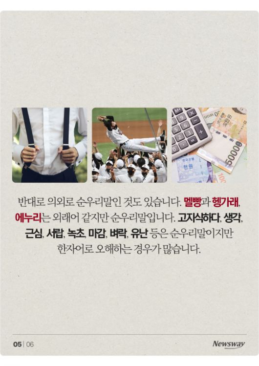 반대로 의외로 순우리말인 것도 있습니다. 멜빵과 헹가래, 에누리는 외래어 같지만 순우리말입니다. 고지식하다, 생각, 근심, 서랍, 녹초, 마감, 벼락, 유난 등은 순우리말이지만 한자어로 오해하는 경우가 많습니다.