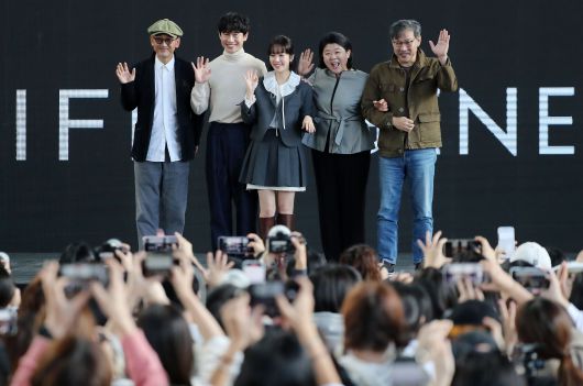 티빙 오리지널 시리즈 '욘더'의 이준익 감독(왼쪽부터)과 배우 신하균, 한지민, 이정은, 정진영이 지난 7일 부산 해운대구 영화의전당 야외무대에서 열린 제27회 부산국제영화제 오픈 토크에서 포즈를 취하고 있다. /뉴스1 |