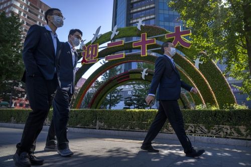 중국 베이징 도심에 설치된 공산당 제20차 당 대회 기념 조형물 앞으로 마스크를 쓴 시민들이 지나가고 있다. AP연합뉴스 |
