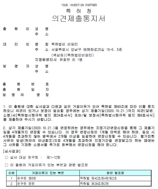 따라서 출원인은 의견제출통지서를 특허가 등록되기 위해 거쳐야 하는 통과의례로 이해하고, 거절이유에 대응하는 과정에서 해당 특허를 더욱 단단하게 만들 수 있는 기회로 삼는 것이 필요하다.