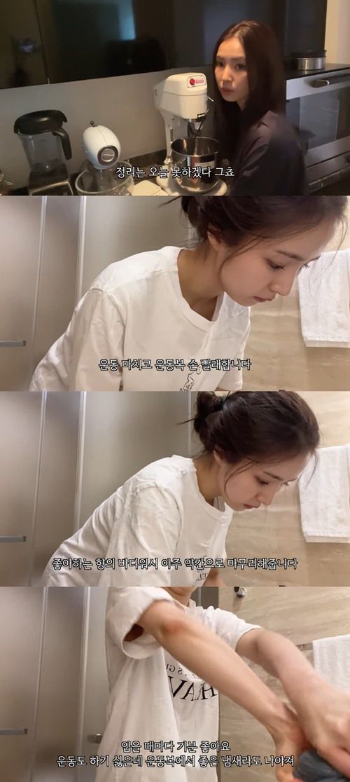 또 제주에 드라마 촬영을 하러 가 운동을 매일매일 하더니 "운동 마치고 운동복은 손 빨래한다"며 "보통 출장 오면 비누로 손 빨래하고 좋아하는 향의 바디워시 아주 약간으로 마무리한다"고 알렸다.