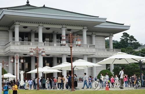 줄지어 차례 기다리는 청와대 본관 관람객 |