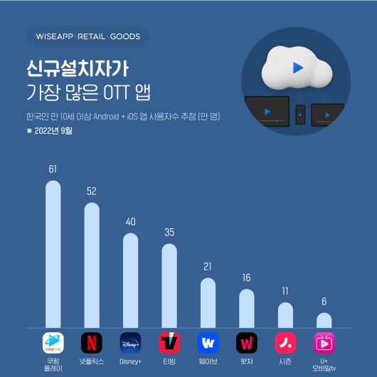 앱/리테일 분석 서비스 와이즈앱·리테일·굿즈가 한국인 만 10세 이상 스마트폰 사용자(Android + iOS)를 표본 조사한 결과, 지난 9월 신규 설치자가 가장 많은 OTT 앱은 쿠팡플레이로 신규 설치자가 61만 명이었다.
