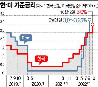 ◆고환율 물가 추가 상승압력…베이비스텝 소수 의견 나와= 한은 금융통화위원회는 이날 오전 통화정책방향 결정회의를 열고 기준금리를 연 2.5%에서 3.00%로 상향 조정했다. 한은은 올해 들어 기준금리를 1월, 4월 각각 0.25%포인트 인상했으며, 7월 0.50%포인트를 올려 사상 첫 빅스텝을 단행한 바 있다. 이후 8월 0.25%포인트, 이날 두 번째 빅스텝을 밟으면서 2012년 10월 금리수준인 3.00%로 돌아갔다.