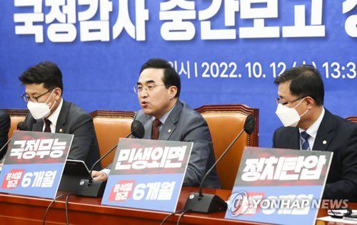 그는 올해 국감을 두고도 "윤석열 정부의 총체적 난국의 집약판"이라며 "인사, 외교, 경제, 안보, 민생 참사까지 역대급 참사가 꼬리에 꼬리를 무는 '꼬꼬무 국감'이다. 참사가 참사를 덮는 비정상적 국정운영"이라고 비난했다.