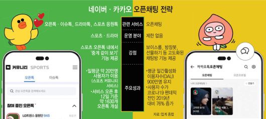양사의 오픈채팅 전략은 비슷해 보이지만 다르다. 우선 카카오는 운영 분야에 특별한 제한이 없다. 스포츠, 드라마 등 특정 주제뿐만이 아니라 모든 분야에 대해 오픈채팅방을 개설할 수 있다. 네이버는 스포츠 분야에 한해 오픈톡을 운영하는 버티컬 전략을 구사하고 있다. 농구, 배구, 농구, 골프 등의 스포츠 종목을 세분화해서 다양한 종목, 카테고리, 키워드를 설정할 수 있다. 특히 오픈톡 내 '중계 같이보기' 기능을 제공, 함께 응원하며 스포츠 경기를 실시간으로 즐길 수 있다는 점이 특징이다. 이들 서비스는 오픈 이후 일평균 약 20만명 사용자가 이용하고 있으며 12일 기준 약 1630개 오픈톡이 개설됐다.