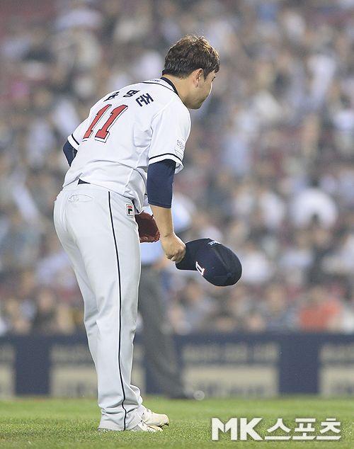 두산 투수 윤명준이 사구를 내준 뒤 타자에게 사과하고 있다. 사진=천정환 기자 |