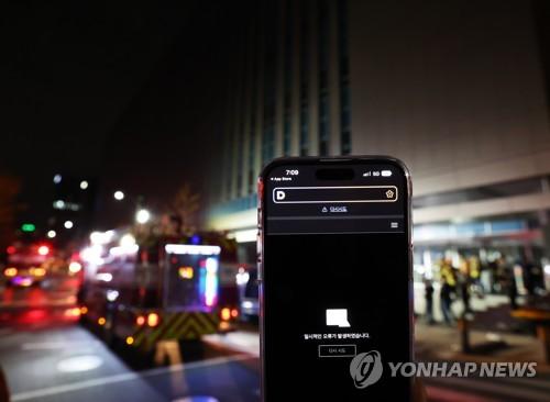 (성남=연합뉴스) 홍기원 기자 = 15일 오후 화재가 발생한 경기도 성남시 분당구 삼평동 SK 판교 캠퍼스 A동 앞에서 스마트폰 다음 애플리케이션에 오류 메시지가 표시되고 있다.