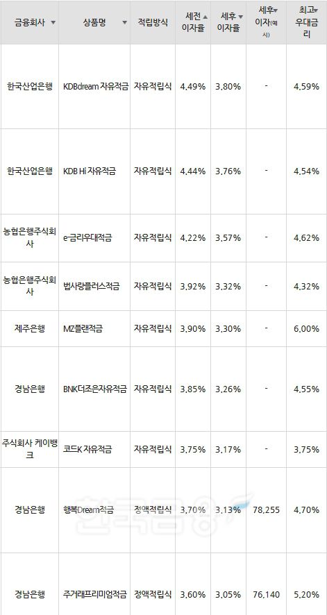 [한국금융신문 김관주 기자] 10월 둘째 주 시중은행 24개월 만기 적금 상품 가운데 세전 이자율 기준 최고금리는 연 4.49%인 것으로 나타났다. 한국은행의 기준금리 인상으로 은행들이 잇달아 수신금리를 올리고 있다. 우대조건 등을 활용하면 0.1%포인트라도 높은 금리를 받을 수 있어 꼼꼼히 살펴볼 필요가 있다.