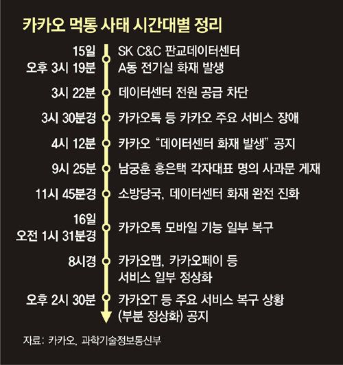 문제가 반복적으로 발생하는데도 근본적 대책 마련이 미흡했다는 비판도 있다. 이달 4일 카카오톡 PC 버전이 18분간 장애를 일으키는 등 이번 화재 전에도 올해만 5차례 카카오 서비스에서 장애가 발생했다.