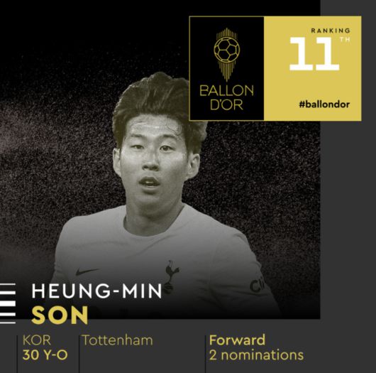 손흥민은 18일(한국시간) '프랑스 풋볼'이 주관하는 발롱도르 시상식에서 11위를 차지했다. 2022 발롱도르 시상식은 2021-22시즌 활약상을 바탕으로 선정한다.
