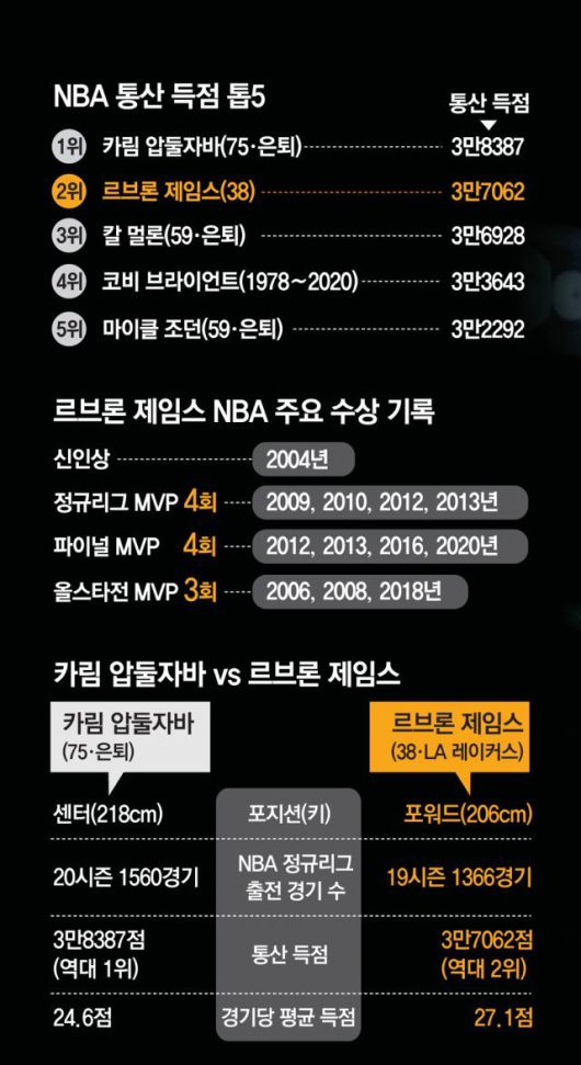 2003∼2004시즌 클리블랜드 유니폼을 입고 NBA에 데뷔한 제임스는 올해 20번째 시즌을 맞는다. 19시즌 동안 1366경기에 출전해 3만7062점(경기당 평균 27.1점)을 쌓았다. 통산 득점 역대 2위다. NBA에서 제임스보다 득점을 많이 한 선수는 ‘스카이 훅슛’으로 유명했던 카림 압둘자바(75·은퇴) 한 명뿐이다. 1989년까지 20시즌을 뛴 압둘자바는 1560경기에서 3만8387점(평균 24.6점)을 넣었다. 제임스보다 1325점이 많다.