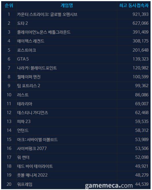 일 최고 동시접속자 TOP 20에서는 중하위권의 동시접속자 수가 전반적으로 감소한 가운데, 사이버펑크 2077의 최대 동시접속자 수가 약 2만여 명가량 줄어들어 16위로 하락했다. 이어 데드 바이 데이라이트 순위도 18위로 3단계 내려갔다.