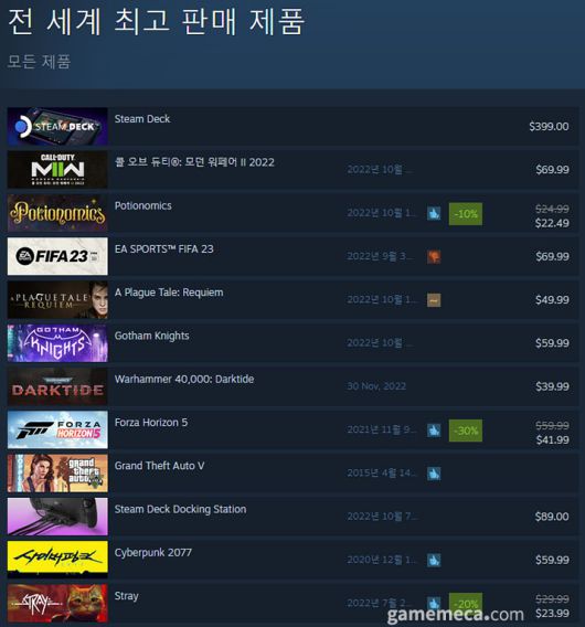 ▲ 10월 18일 오후 1시 기준 스팀 전세계 최고 판매 제품 TOP10 (자료출처: 스팀) |