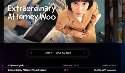 드라마 '이상한 변호사 우영우'가 7월 11일부터 17일까지 한 주 동안 한국을 비롯해 홍콩, 인도네시아, 싱가포르 등 8개국에서 정상을 차지하며 비영어 드라마 주간 시청 시간 1위를 차지했다. 넷플릭스 캡처 |