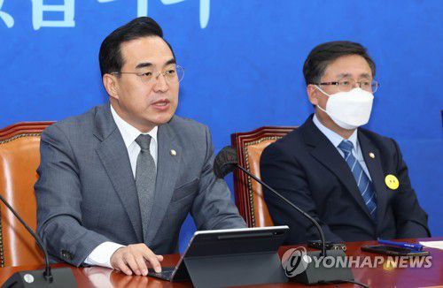 (서울=연합뉴스) 고동욱 정윤주 기자 = 더불어민주당 박홍근 원내대표는 19일 '서해 공무원 피격 사건'을 수사 중인 검찰이 서욱 전 국방부 장관과 김홍희 전 해양경찰청장의 구속영장을 청구한 것에 대해 "대통령실의 기획 사정이 막장 드라마로 치닫고 있다"고 비난했다.