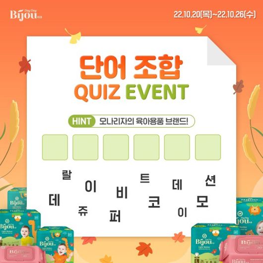 [세계비즈=황지혜 기자] 생활위생 전문 그룹인 MSS 그룹 산하의 모나리자가 오는 26일까지 유아 전문 브랜드 ‘데이데이비쥬(DayDayBijou)’ 공식 인스타그램 채널에서 단어 조합 퀴즈 이벤트를 진행한다고 20일 밝혔다.