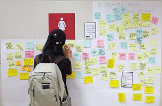 ‘역무원 스토킹 살해 사건’이 발생한 서울 지하철 2호선 신당역 여자화장실 입구에 마련된 추모공간에서 지난달 16일 한 시민이 추모 메시지를 남기고 있는 모습. [연합] |