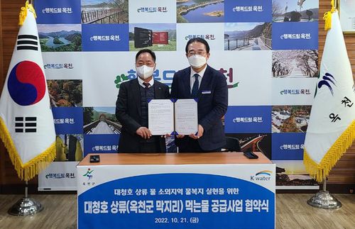 옥천군은 21일 한국수자원공사 대청댐지사와 '대청호 상류지역 먹는물 공급사업'을 위한 협약을 했다.