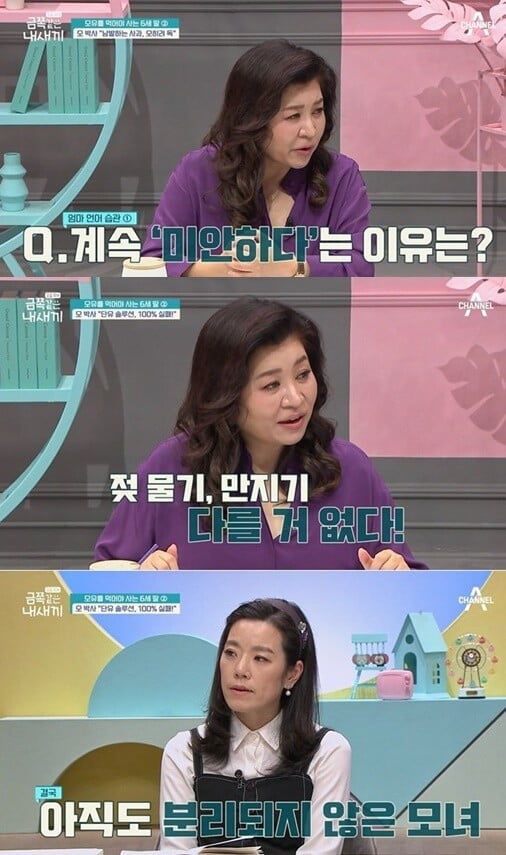 한편 금쪽이 엄마는 솔루션 실행을 하며 모유를 끊어가는 상황에서도 모유 수유 대신 가슴을 만질 수 있게 허용하는 애매한 태도를 보였다. 그는 "60~70% 성공한 것 같다"고 만족한 모습을 보였지만 오은영 박사는 "젖을 무는 것과 만지는 건 다를 게 없다. 단유는 엄마와의 분리를 의미한다. 금쪽이가 엄마와 딱 붙어있다. 신체적 독립이 되지 않고 있다"며 "두 사람 모습은 이상한 덩어리 같다. 반쪽 성공도 아닌 100% 실패다"라고 쓴소리를 했다.
