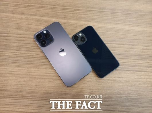 아이폰 14 프로맥스와 아이폰13 미니 제품은 카메라 렌즈 높이에서 큰 차이를 보인다. /최문정 기자 |